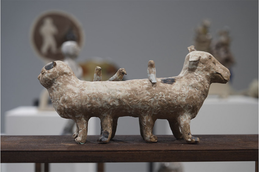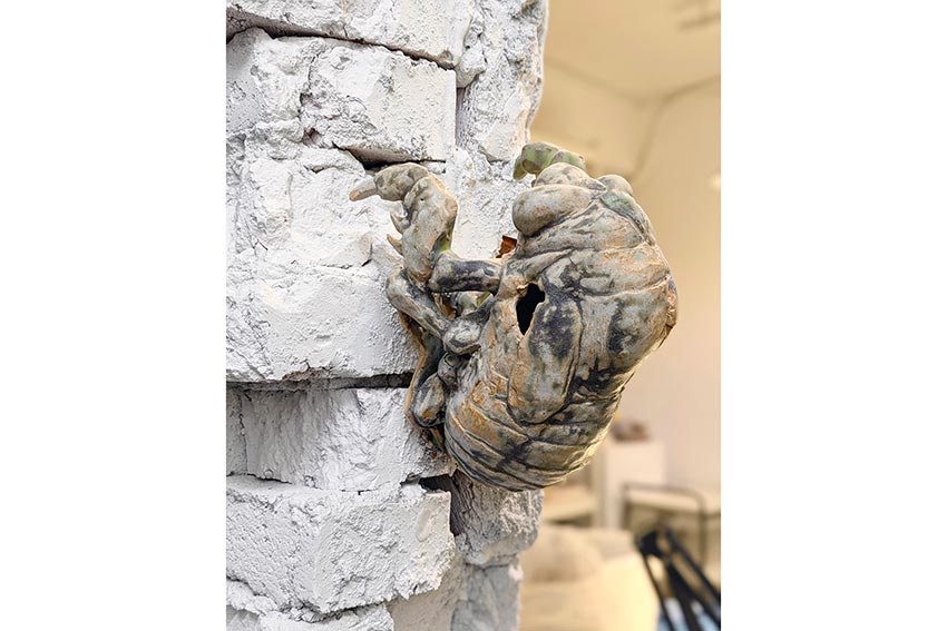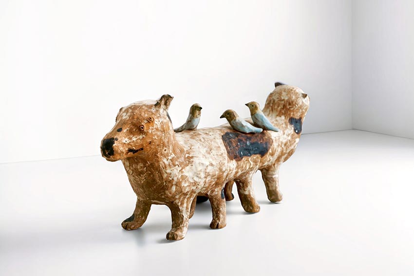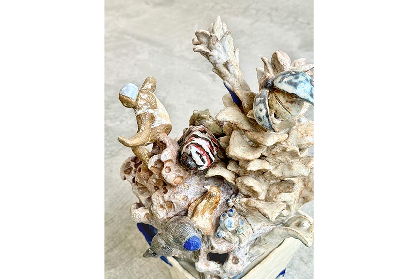 In her sculptures and paintings, she boldly employs mixed media — clay, glaze, glass, pigments, and other materials — layering textures and sensations. By doing so, she seeks to dissolve conventions, blurring the boundaries between sculpture and painting, art and life, past and present, old and new, form and thought, reality and dream, function and ornament.