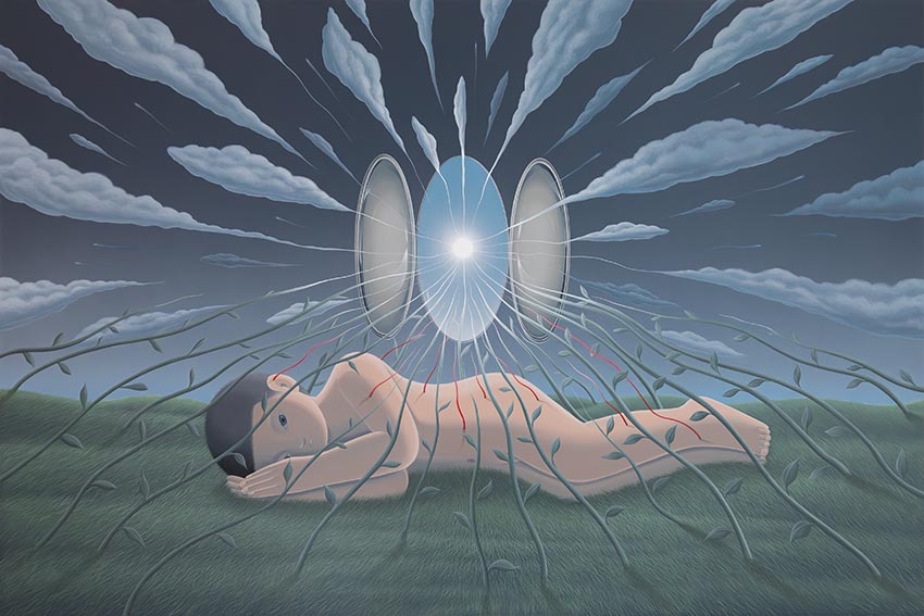 貢坎的繪畫作品融合超現實主義與時間元素,運用平面化圖形筆觸描繪人類形象,既有互動場景,也有孤獨姿態。儘管柔和色調與流暢圖形表現出寧靜感,但畫面中的黑色形態常將這份平和打破,增添了強烈的視覺張力。