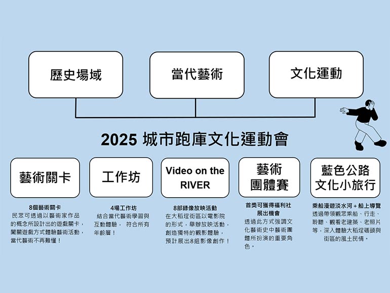 由台灣視覺藝術協會 (視盟) 發起的《城市跑庫文化運動會》,自2024年首次舉辦便引起廣大迴響,今年將於10月25日至26日再度登場。活動邀請民眾走進大稻埕碼頭與淡水河畔,以「文化折返跑」串聯當代藝術、歷史場域與文化運動三大元素,透過藝術遊戲化的關卡設計,讓參與者在趣味互動中重返台灣藝術史的路徑,將城市轉化為充滿文化能量的全民運動場。